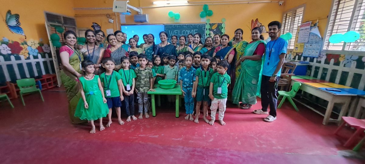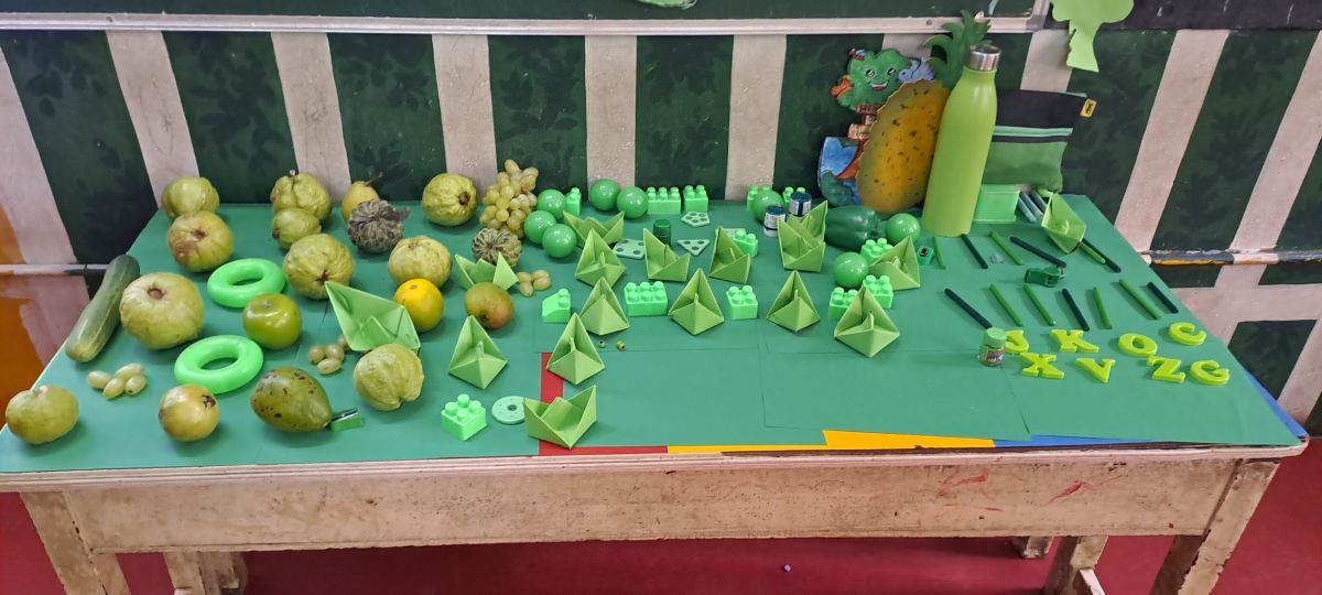 Nalanda English Medium School celebrated Green day on 9th July 2025 with a smile. All the students came in green dress, student brought one green colour fruit along with them. The classroom was fully decorated with green coloured balloons. Green colour object displayed on the table. We decorated the blackboard with green colour object pictures.